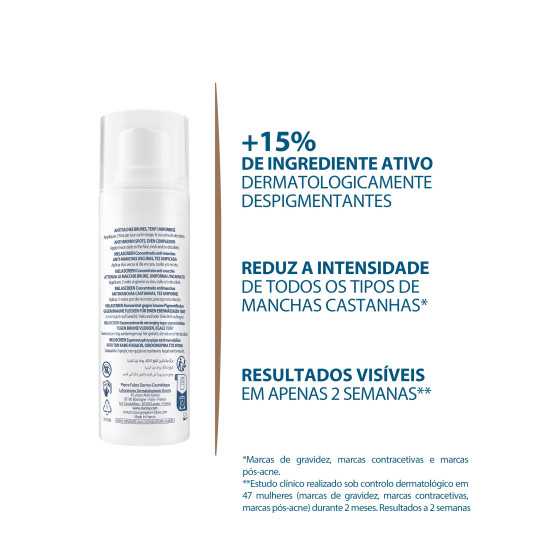• Altamente concentrado com mais de 15% de ingredientes ativos dermatológicos despigmentantes, este cuidado orientado e inovador atua em 3 níveis diferentes para oferecer uma despigmentação seletiva mesmo sobre as manchas castanhas mais difíceis de corrigir, preservando ao mesmo tempo a pigmentação natural da pele